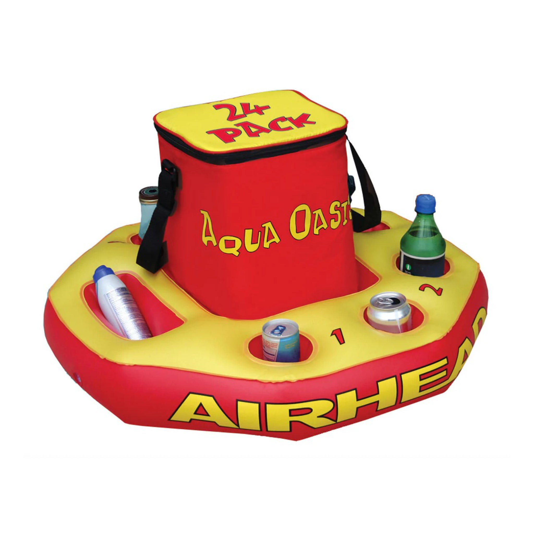 Keep the good times floating with the Airhead Inflatable Cooler Aqua Oasis. This inflatable floating cooler for river and lake days features a removable insulated, leak proof nylon cooler with an adjustable shoulder strap that keeps up to 24 cans ice cold for hours. Six numbered cup holders in the vinyl base help everyone track their drinks, while a handy sundry pocket stashes sunscreen. A molded rope connector lets you tether it to a lounge, swim platform, boat, or dock.